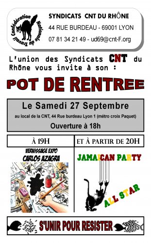 L’Union des Syndicats CNT du Rhône vous invite à son pot de rentrée le samedi 27 septembre, à partir de 18 heures, dans son local 44 rue Burdeau, 69001 Lyon.