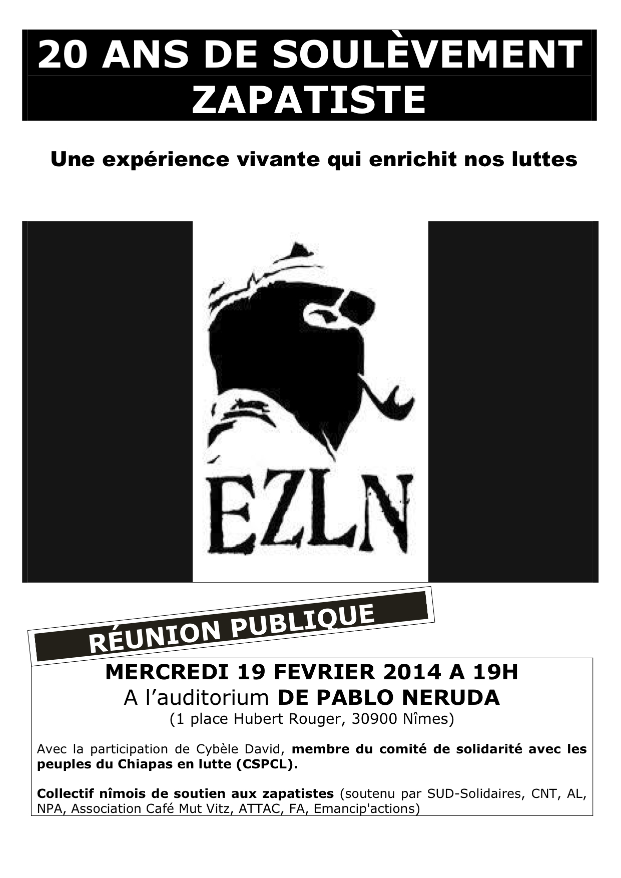 Pour débattre ensemble de la lutte zapatiste, le Collectif nîmois de soutien aux zapatistes organise une réunion publique à l’Auditorium de Pablo Neruda le mercredi 19 février 2014 à 19 heures.