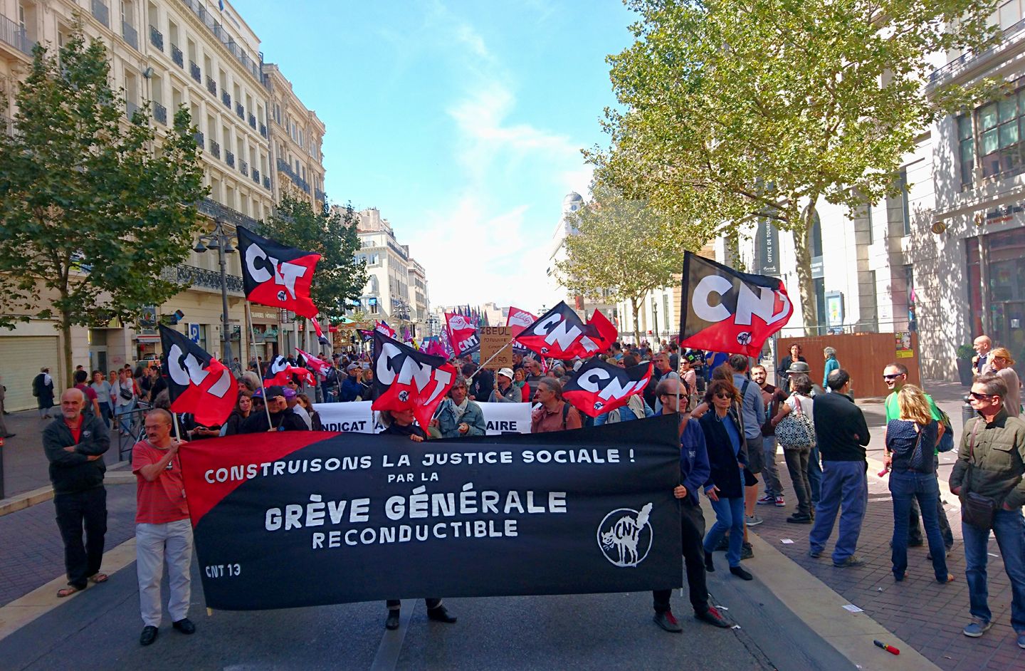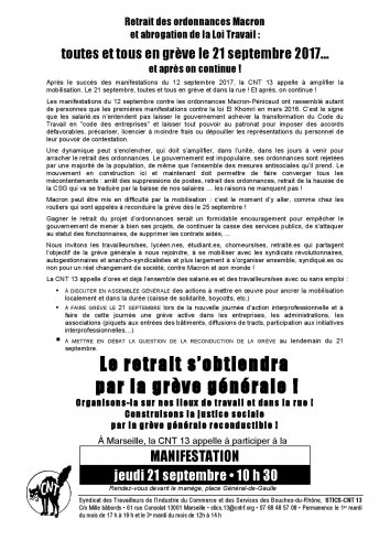 Après le succès des manifestations du 12 septembre 2017, la CNT 13 appelle à amplifier la mobilisation. Le 21 septembre, toutes et tous en grève et dans la rue ! Et après, on continue !
