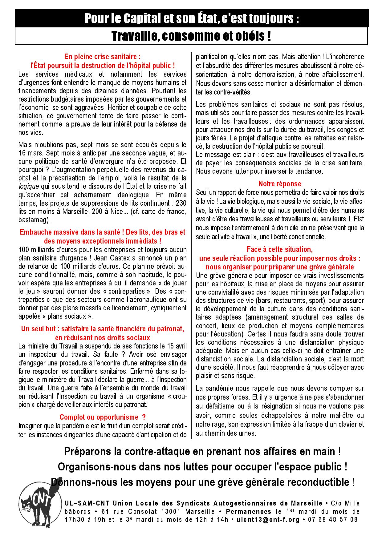 Mais n’oublions pas, sept mois se sont écoulés depuis le 16 mars. Sept mois à anticiper une seconde vague, et aucune politique de santé d’envergure n’a été proposée. Et pourquoi ? L’augmentation perpétuelle des revenus du capital et la précarisation de l’emploi, voilà le résultat de la logique qui sous tend le discours de l’État et la crise ne fait qu’accentuer cet acharnement idéologique. En même temps, les projets de suppressions de lits continuent : 230 lits en moins à Marseille, 200 à Nice... (cf. carte de france, bastamag).