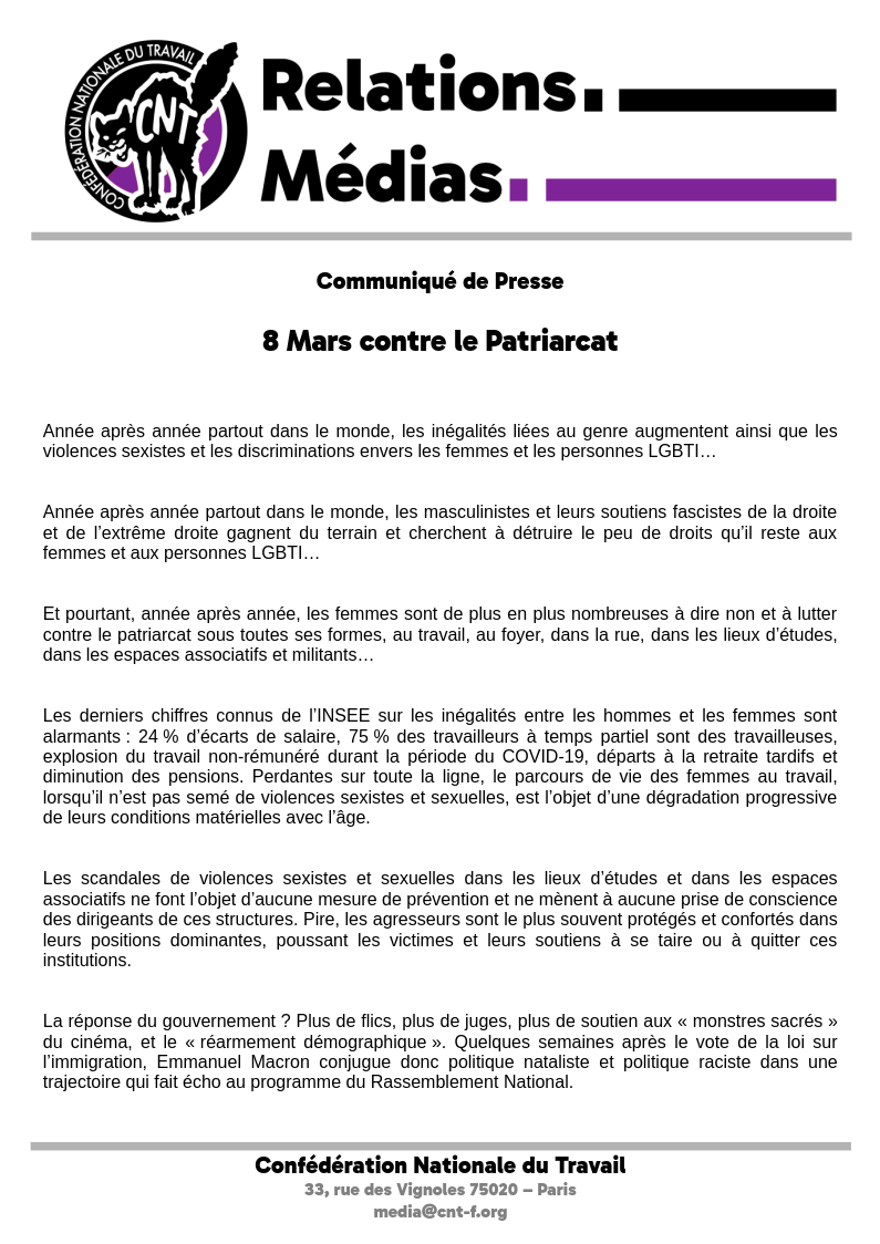 • La CNT exige l’égalité sociale réelle, la fin des discriminations liées au genre au travail comme dans toutes les sphères de la société et que cesse le refoulement de nos camarades exilées fuyant guerres, misère et dérèglement climatique.