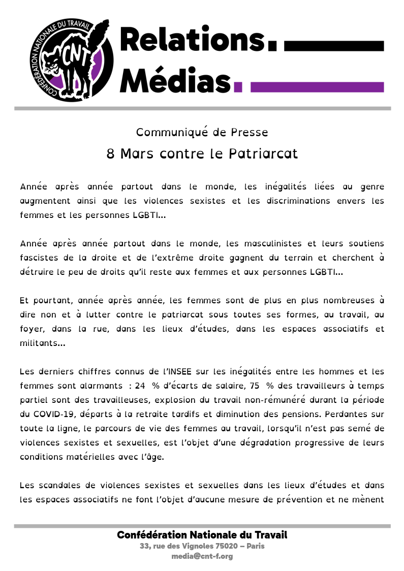 • La CNT soutien les initiatives d’organisation des femmes sur leur lieu de travail et en dehors, sans patron, sans patronne, sans machiste et sans récupération par des mouvements réformistes cherchant le compromis quitte à laisser nos camarades sur le bord du chemin. Nous ne voulons pas d’aménagements du système patriarcal, nous voulons son abolition et, avec lui, la fin du capitalisme et du sexisme.