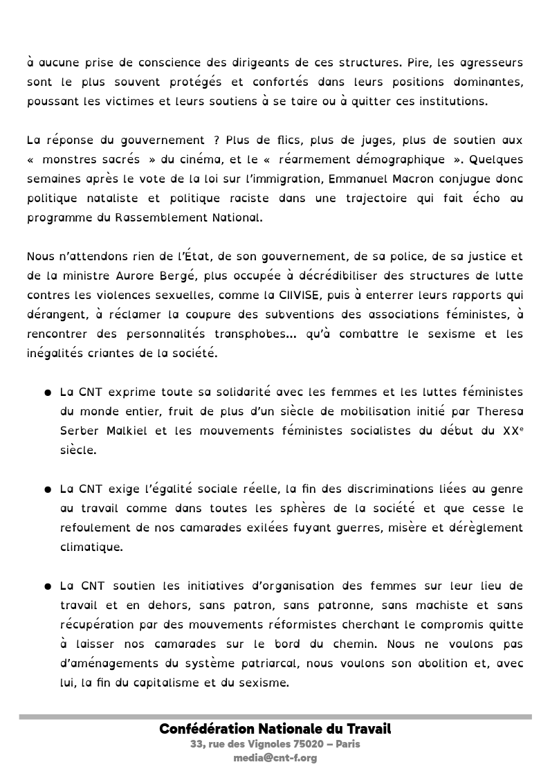 • La CNT exprime toute sa solidarité avec les femmes et les luttes féministes du monde entier, fruit de plus d’un siècle de mobilisation initié par Theresa Serber Malkiel et les mouvements féministes socialistes du début du XXᵉ siècle.