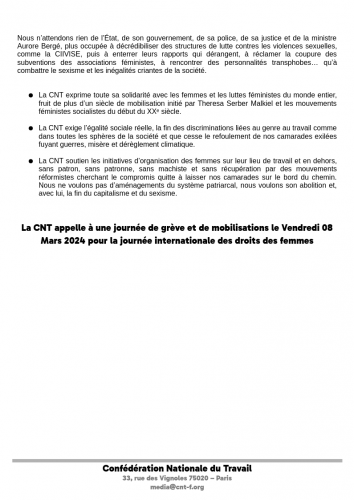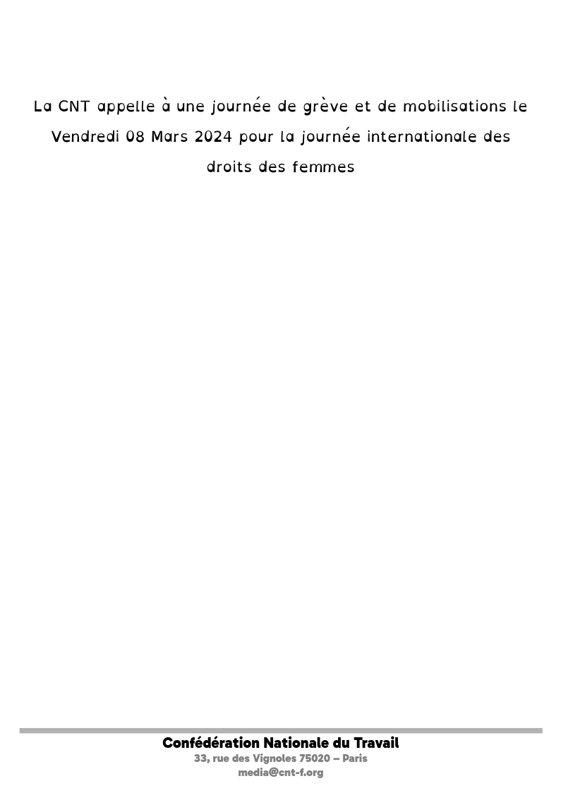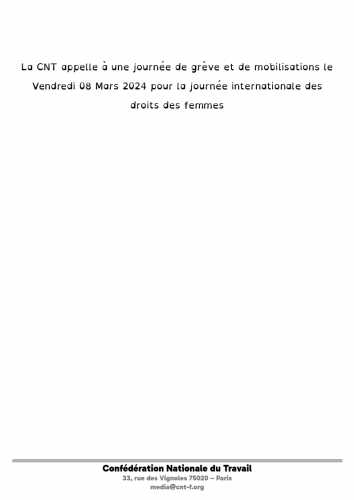 La CNT appelle à une journée de grève et de mobilisations le Vendredi 08 Mars 2024 pour la journée internationale des droits des femmes