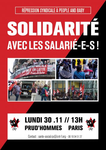 L’attitude de People & Baby n’est bien sûr et malheureusement pas un cas isolé. D’autres camarades sont frappés de plein fouet par la répression (Ecole Spéciale d’Architecture, Air France, La Poste, Tefal, Education nationale, ...) qui s’inscrit dans un contexte d’attaques généralisées de la part du gouvernement, main dans la main avec le patronat, contre le droit du travail (Accord National Interprofessionnel, Loi Macron entre autres).