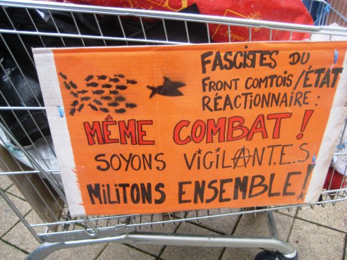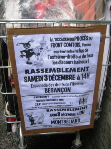 Avant de dissoudre la manif, une dernière prise de parole a eu lieu au pont Battant pour rappeler le procès du front comtois, le jeudi 8 décembre 2011, à 9h au TGI de la Petite Hollande à Montbéliard.