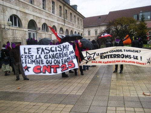 Ce samedi 3 décembre 2011, malgré le temps pluvieux, nous étions près d’une centaine de militant.e.s de différents horizons (anti-fascistes, anarchistes, syndicalistes, membres d’AC, du PG, du NPA, mais aussi un bon nombre de “non-encarté.e.s”) rassemblé.e.s à l’appel du syndicat CNT 25, du Groupe Proudhon de la FA, du Scalp Besak et des libertaires pour manifester notre refus de l’extrême-droite et de ses idées nauséabondes.