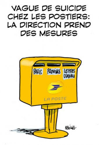 Il y avait Lombard alors PDG de France Telecom qui qualifiait la vague de suicide de « mode », il y a maintenant Bailly qui affirme « qu’il n’y a pas de malaise à La Poste, mais que certains postiers sont en difficulté quand se combinent, à l’occasion de situations de réorganisations, des échecs professionnels et des fragilités personnelles ». « Le taux de suicides chez nous est en fait inférieur au reste de la population », dit également M. Bailly. Nous constatons qu’il aborde avec froideur et désinvolture le malaise social à La Poste en réduisant les nombreux drames à un détail statistiques. Il s’en prend également aux syndicats en les accusant de « monter en épingle tel ou tel épisode strictement personnel ».