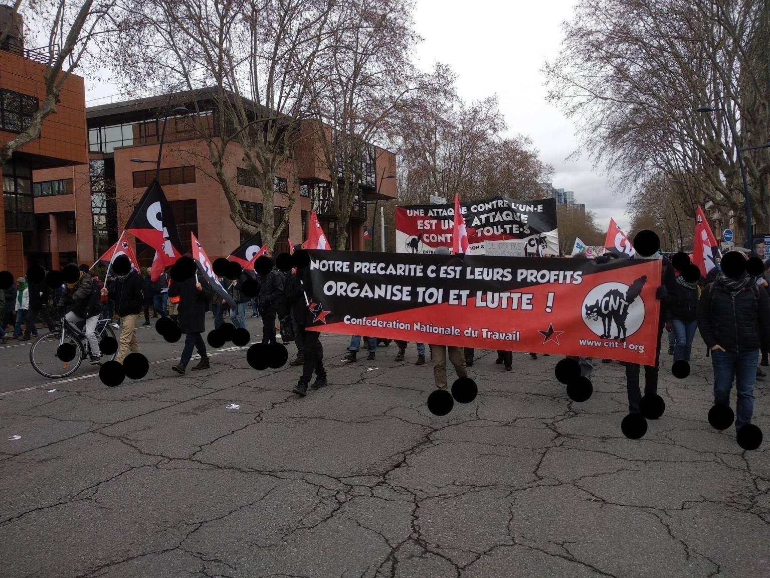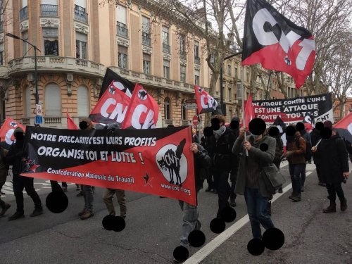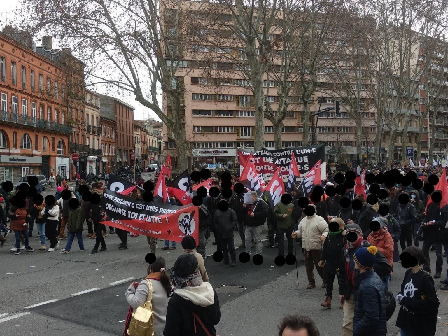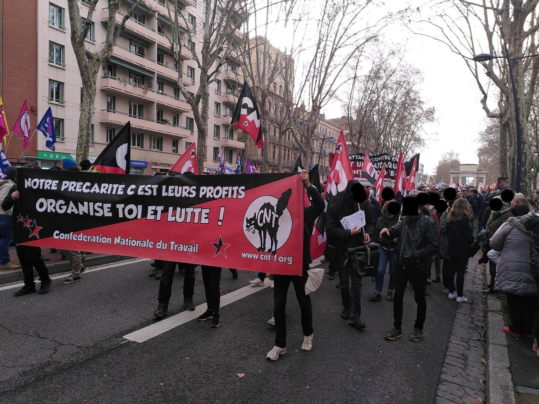 La CNT Industries & Services 31 était présente dans le cortège de l’importante manifestation toulousaine de ce 19 janvier 2023 contre le projet de contre-réforme des retraites. De nombreux·euses sympathisant·es nous ont rejoins pour crier la même colère à l’égard d’un gouvernement qui n’a de cesse de piétiner les droits des travailleur·euses, des chômeur·euses, des étudiant·es, des précaires bref, de toute personne n’étant pas née avec une cuillère en argent dans la bouche, alors qu’en même temps il octroie une augmentation du budget de l’armée de 60%.