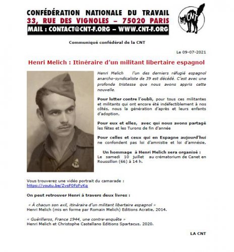 Henri Melich l’un des derniers réfugié espagnol anarcho-syndicaliste de 39 est décédé. C’est avec une profonde tristesse que nous avons appris cette nouvelle.