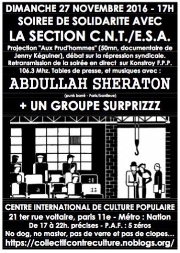 Dimanche 27 novembre à partir de 17h : Soirée de solidarité avec la section ESA-CNT (École Spéciale d’Architecture)