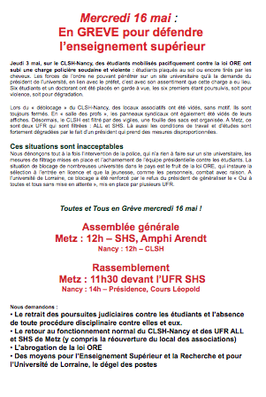 Jeudi 3 mai, sur le CLSH-Nancy, des étudiants mobilisés pacifiquement contre la loi ORE ont subi une charge policière soudaine et violente : étudiants plaqués au sol ou encore tirés par les cheveux. Les forces de l’ordre ne pouvant pénétrer sur un site universitaire qu’à la demande du président de l’université, en lien avec le préfet, c’est avec son assentiment que cette charge a eu lieu. Six étudiants et un doctorant ont été placés en garde à vue, les six premiers étant poursuivis, soit pour violence, soit pour dégradation.