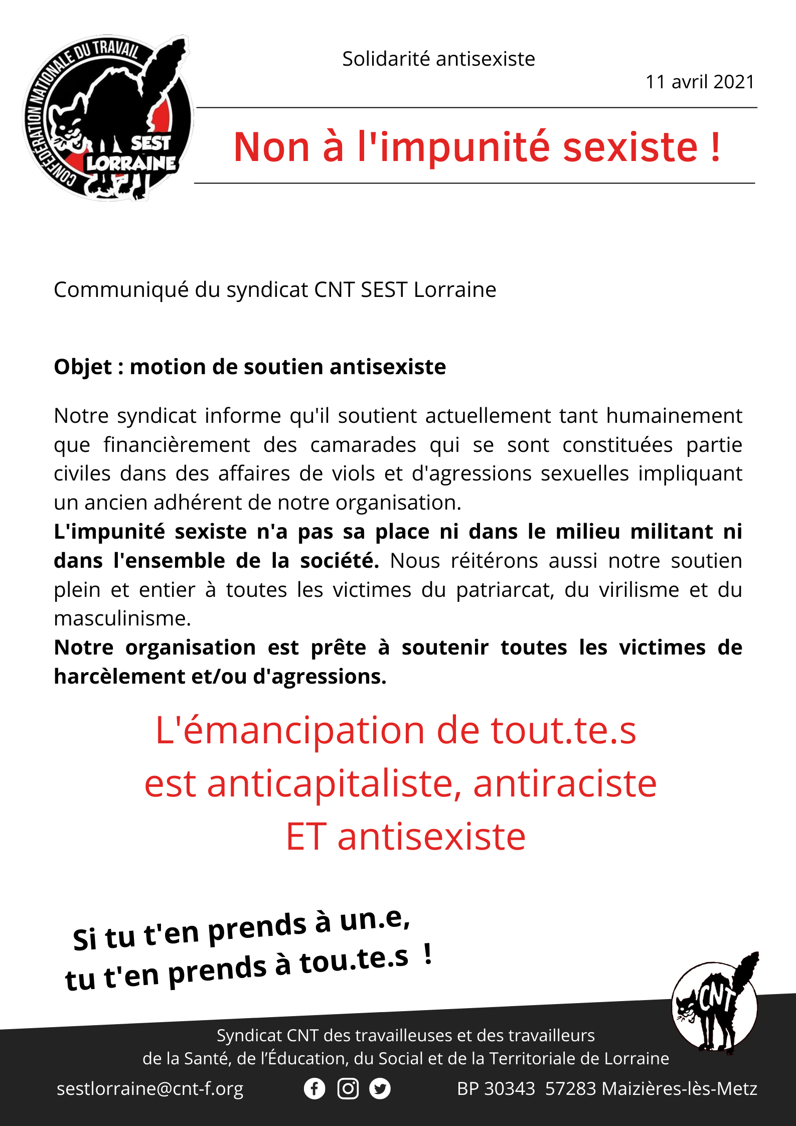 L’impunité sexiste n’a pas sa place ni dans le milieu militant ni dans l’ensemble de la société. Nous réitérons aussi notre soutien plein et entier à toutes les victimes du patriarcat, du virilisme et du masculinisme.