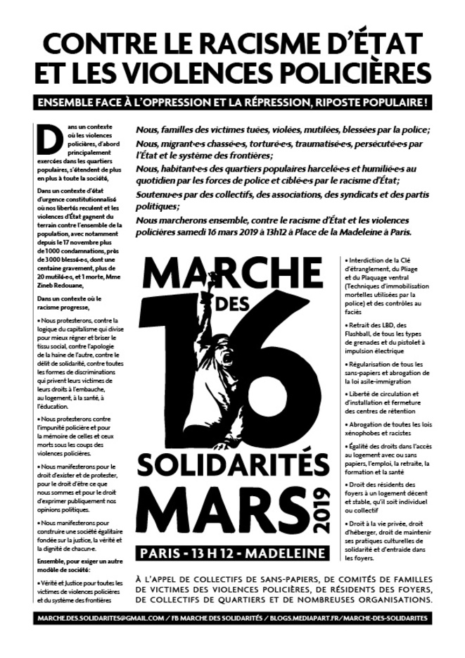 Nous serons dans la rue à Paris comme dans les autres capitales européennes. A l’appel des familles de victimes des violences policières, des collectifs de sans-papiers, des résidentEs des foyers, des collectifs et associations de l’immigration et des quartiers. Parce que la riposte est dans la solidarité et la solidarité dans la riposte.