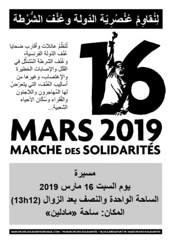 20è Solidaires avec tou-te-s les migrant-e-s, Action Antifasciste Paris-Banlieue (AFA Paris-Banlieue), Act-Up Paris, AFD International, Assemblée citoyenne de Paris 14, Assemblée citoyenne des originaires de Turquie (ACORT), Assemblée de la Multicontinentale, Association Culturelle des Travailleurs Immigres de Turquie (ACTIT), Association des Familles des Prisonniers et Disparus Sahraouis (AFAPREDESA), Association Femmes Plurielles, Association Hirondelle de Martigné-Ferchaud (35), Association Marocaine des Droits Humains (AMDH-Paris/IdF), Association de Solidarité et d’Information pour l’accès aux droits des étrangers extra communautaire (ASIAD), Association des Travailleurs Maghrébins de France (ATMF), Association des Tunisiens en France (ATF), ATTAC-France, ATTAC-Rennes, Association pour la paix en Syrie, Association WISE, Centre de recherche et d’information pour le développement (CRID), Cercle Louis Guilloux, CADTM France, Collectif Cases Rebelles, Collectif de Défense des jeunes du Mantois, Collectif Faty Koumba, Collectif Gilets Jaunes IdF-Rungis, Collectif Irrécupérables, Collectif Ivryen de Vigilance Contre le Racisme (CIVCR), Collectif de Lutte AntiCapacitiste (CLAC), Collectif solidarité migrants Paris Centre, Collectif de soutien de l’EHESS aux sans-papiers et aux migrant-es, Collectif Ni guerre Ni état de guerre, Comité contre les violences policières à Pantin, Comité d’Organisation du 10 Mai, Comité pour le Respect des Libertés et des Droits de l’Homme en Tunisie (CRLDHT), D’ailleurs Nous Sommes d’Ici 37, D’Ailleurs Nous Sommes d’Ici 67, Désarmons-les, DesLitsSolidaires, DiEM25 France, Droit au Logement (DAL), Droits Ici Et Là-bas (DIEL), Fédération des associations de solidarité avec tous-te-s les immigré-e-s (FASTI), Fédération des Tunisiens pour une Citoyenneté des deux Rives (FTCR), Femmes Egalité, Femmes en lutte 93, Fondation Frantz Fanon, Front Uni des Immigrations et des Quartiers Populaires (FUIQP), Humans for Women, La Chapelle Debout !, La Révolution est en Marche, Le paria, Libre Lucha, Paris d’exil, Rassemblement Citoyen En Normandie, Réseau Euro-Maghrébin Citoyenneté et Culture (REMCC), Réseau Foi et Justice Afrique Europe, Réseau de Ravitaillement des Luttes en Pays Rennais, Riposte antifasciste, Survie Ile de France, Tous Migrants, Union Juive Française pour la Paix (UJFP), Union des Tunisiens pour l’action citoyenne (UTAC), Zone de Solidarité Populaire 18 (ZSP18),