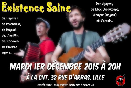 Mardi 1er décembre 2015 à 20h, le groupe acoustique Existence Saine sera en concert à la Maison des syndicats CNT, 32 rue d’Arras à Lille. Entrée libre !!