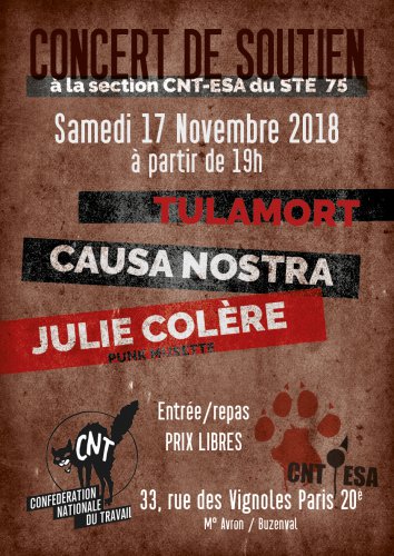 Le Syndicat des travailleurs et des travailleuses de l’éducation de la CNT à Paris (CNT STE 75) organise un concert de solidarité pour la section en lutte de l’ESA (École spéciale d’architecture) aux 33 rue des Vignoles à Paris le samedi 17 novembre à 19H.