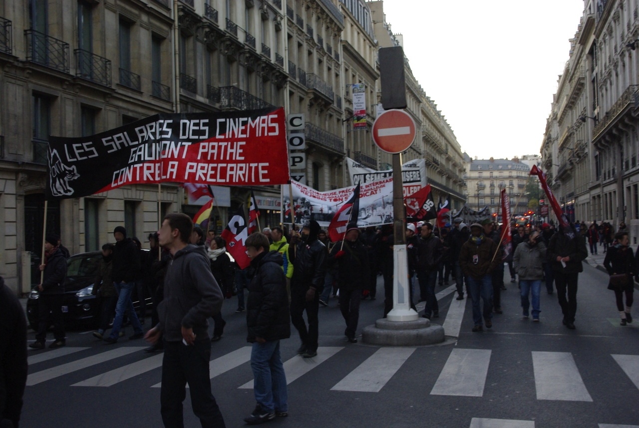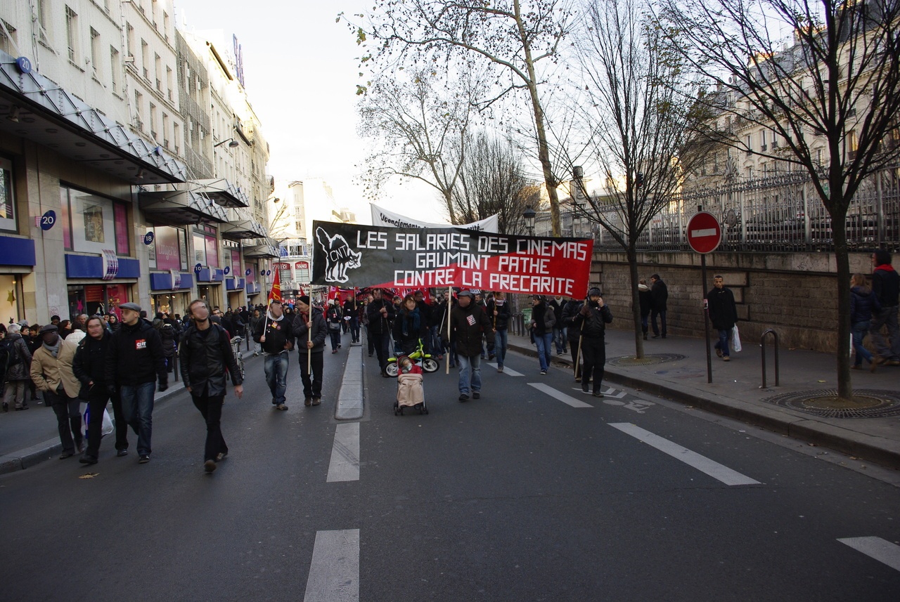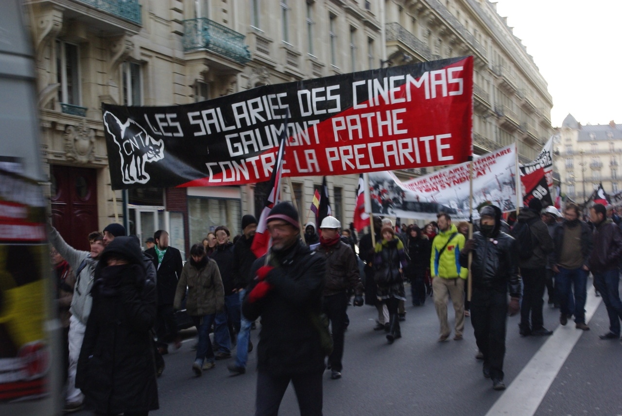 Les syndicats CNT de la région parisienne, défilant lors de la manifestation contre le chômage et la précarité, ont appelé à une prolongation de celle-ci, d’abord en direction d’Altedia, acteur majeur du placement privé (les sous-traitants de Pôle Emploi) puis en direction du Gaumont-Pathé à Opéra où des camarades luttent contre la dévalorisation de leurs métiers.