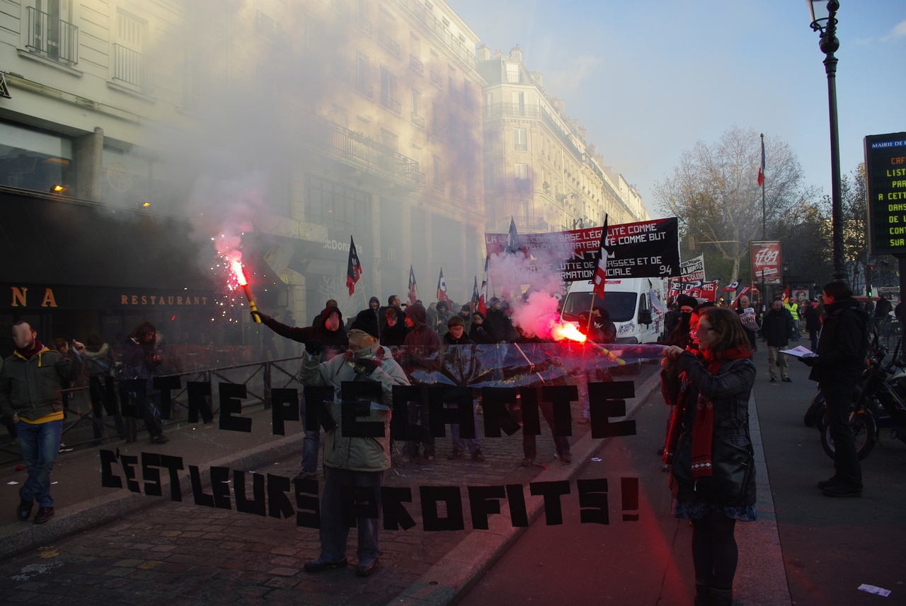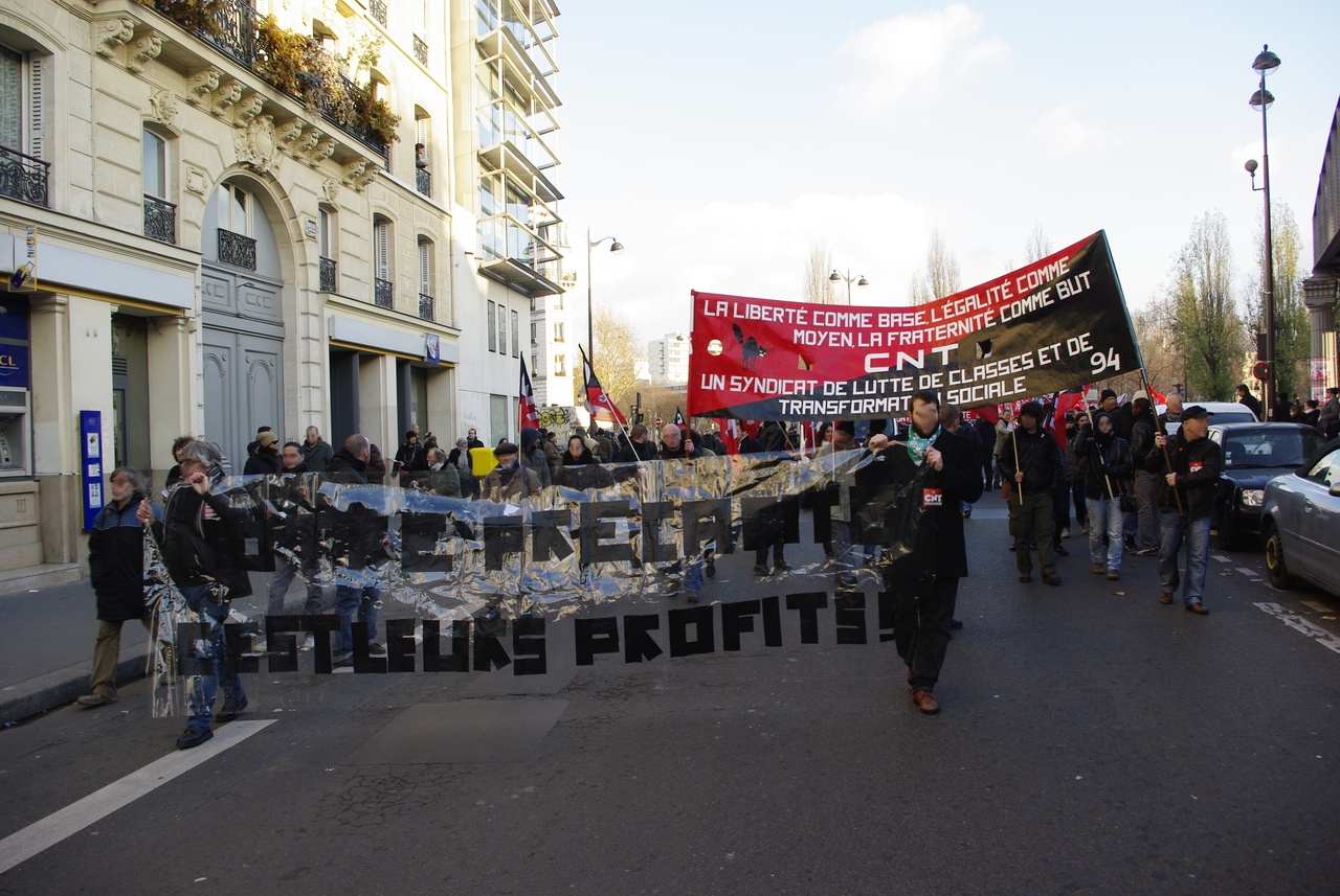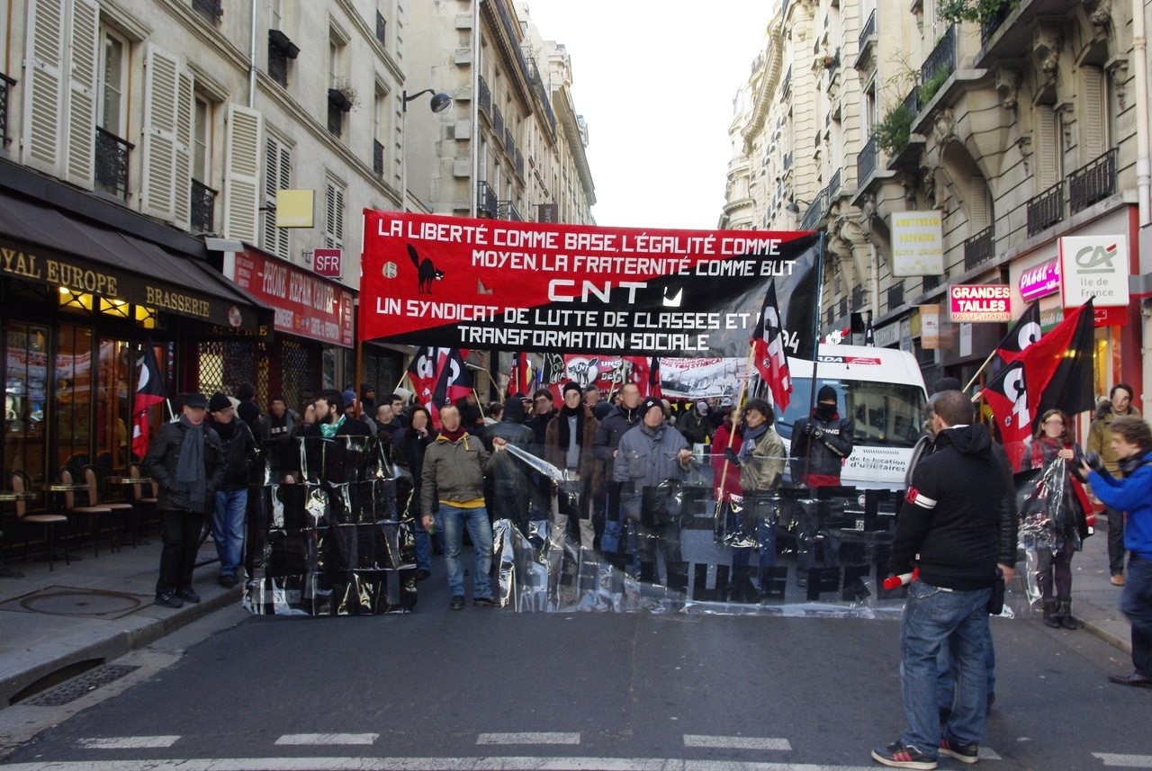 Les syndicats CNT de la région parisienne, défilant lors de la manifestation contre le chômage et la précarité, ont appelé à une prolongation de celle-ci, d’abord en direction d’Altedia, acteur majeur du placement privé (les sous-traitants de Pôle Emploi) puis en direction du Gaumont-Pathé à Opéra où des camarades luttent contre la dévalorisation de leurs métiers.