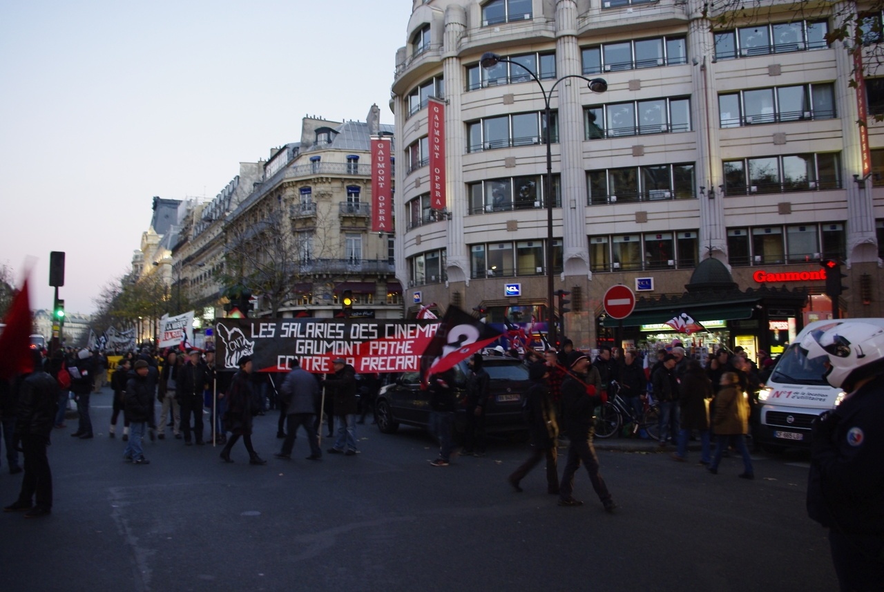 Nous poursuivrons ensuite notre route en direction des trois cinémas Gaumont Pathé du quartier de l’Opéra. Notre section syndicale CNT implantée dans l’entreprise entend dénoncer et organiser la lutte contre la précarisation de leurs emplois. Malgré des bénéfices records, les cinémas Gaumont Pathé virent les projectionnistes des cabines. On leur propose de partir ou devenir vendeurs de pop-corn. Qui pour surveiller les séances ? Personne, ou plus exactement le spectateur lui-même. Quant au hall, toujours plus de tâches et de moins en moins d’effectifs. Résultat : pression et stress au travail. La qualité ? Ils s’en foutent ! Ne les laissons pas casser nos métiers pour amasser encore plus de fric. Réagissons !