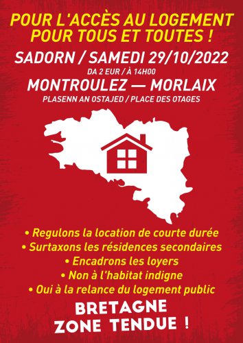 Le Parlement va voter la loi de finances 2023 d’ici le mois de novembre. Faisons-nous force de proposition et de pression sur les députés pour que la dispositif zone tendue soit voté dans la loi. Un amendement l’intégrant fut rejeté en juillet. Un seul élu breton de la majorité l’avait voté. Le 29 octobre nous manifesterons à Morlaix. Rappelons à la députée de la circonscription de Morlaix, Sandrine Le Feur, l’occasion qu’elle avait manqué en juillet afin qu’elle prenne ses responsabilités dans les semaines qui viennent.