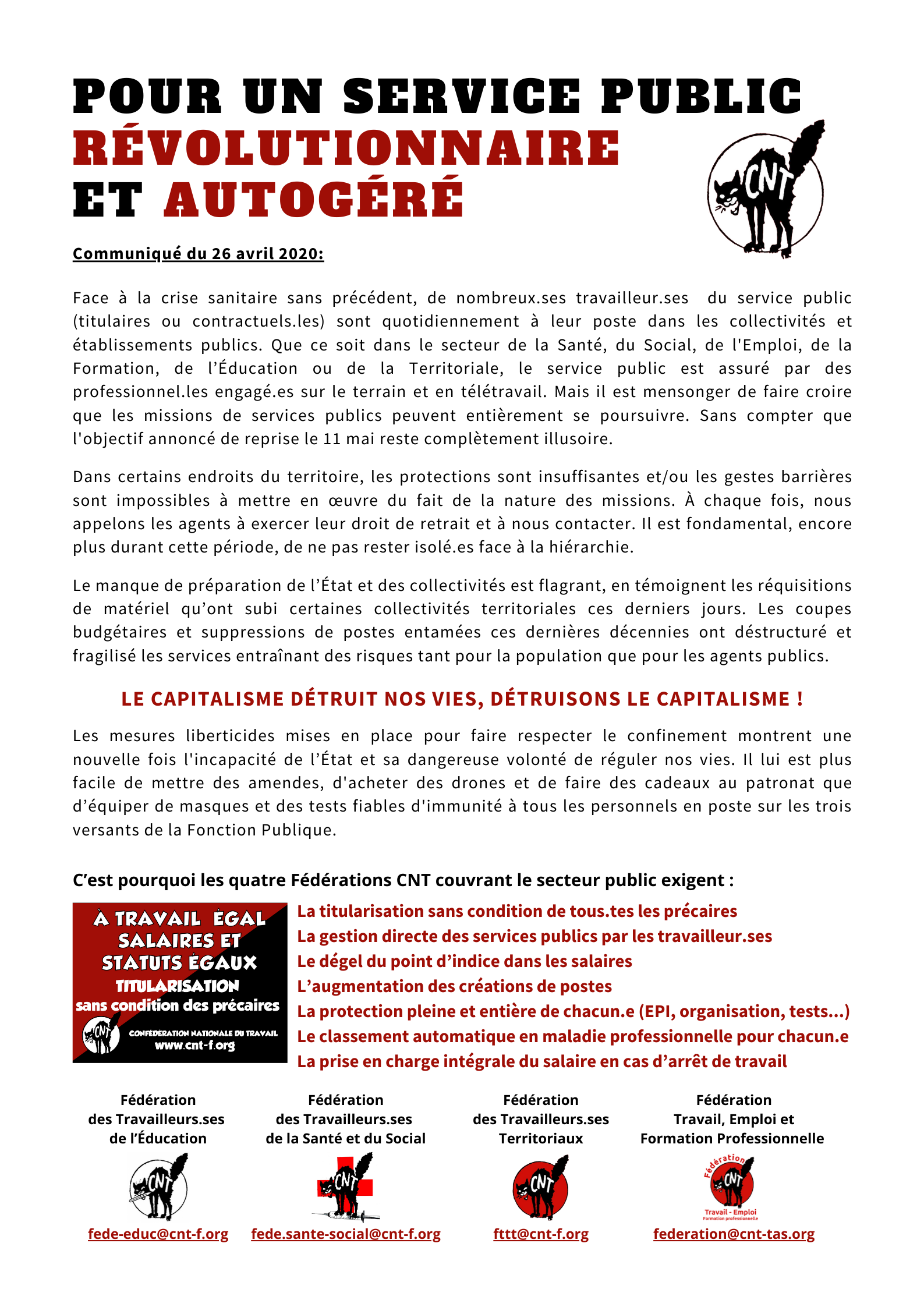 Face à la crise sanitaire sans précédent, de nombreux.ses travailleur.ses du service public (titulaires ou contractuels.les) sont quotidiennement à leur poste dans les collectivités et établissements publics. Que ce soit dans le secteur de la Santé, du Social, de l’Emploi, de la Formation, de l’Éducation ou de la Territoriale, le service public est assuré par des professionnel.les engagé.es sur le terrain et en télétravail. Mais il est mensonger de faire croire que les missions de services publics peuvent entièrement se poursuivre. Sans compter que l’objectif annoncé de reprise le 11 mai reste complètement illusoire.