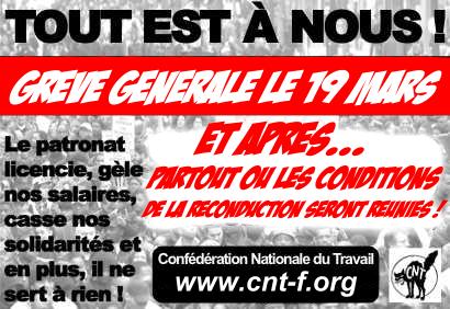 La CNT appelle tous les travailleurs et les travailleuses, avec ou sans emploi, à grossir le plus possible les rangs le 19 mars, afin d’exprimer l’opposition la plus massive à la mafia légale qui sévit du CAC 40 à l’Élysée. Mais parce que les entreprises et leur gouvernement ne voudront rien lâcher sans pression, sans que nous leur imposions un vrai rapport de forces, il faut d’ores et déjà organiser la suite.