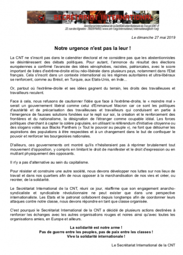 La CNT ne s’inscrit pas dans le calendrier électoral et ne considère pas que les abstentionnistes se désintéressent des débats politiques. Pour autant, l’annonce du résultat des élections européennes a confirmé l’avancée des idées xénophobes, racistes, patriarcales, avec le score important de listes d’extrême-droite et/ou néo-libérale dans plusieurs pays, notamment dans l’Etat français. Cela s’inscrit dans un contexte international où les régimes autoritaires et ultra-libéraux se renforcent, comme au Brésil, en Turquie, aux Etats-Unis, en Inde...