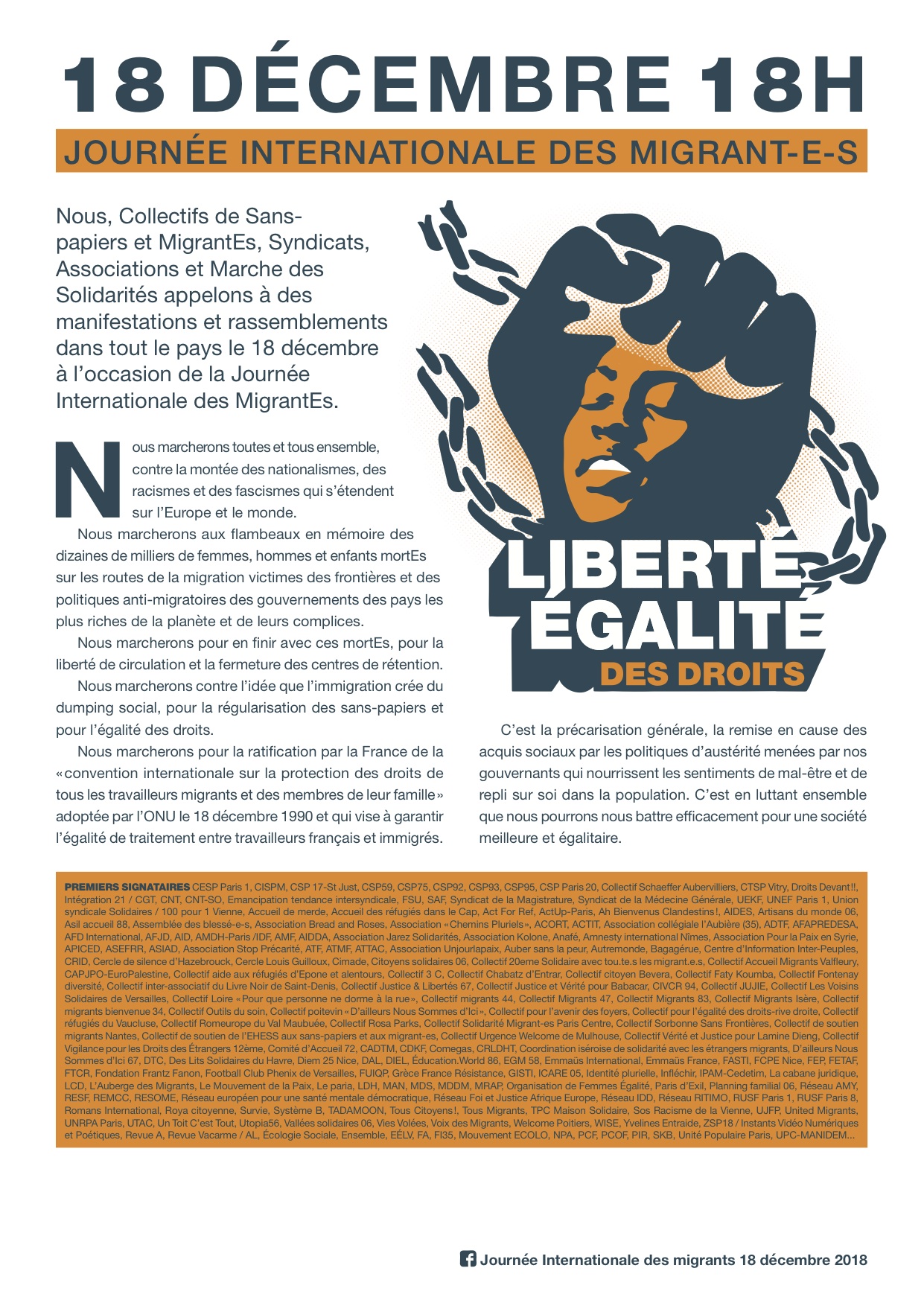 Nous, Collectifs de Sans- papiers et MigrantEs, Syndicats, Associations et Marche des Solidarités appelons à des manifestations et rassemblements dans tout le pays le 18 décembre à l’occasion de la Journée Internationale des MigrantEs.