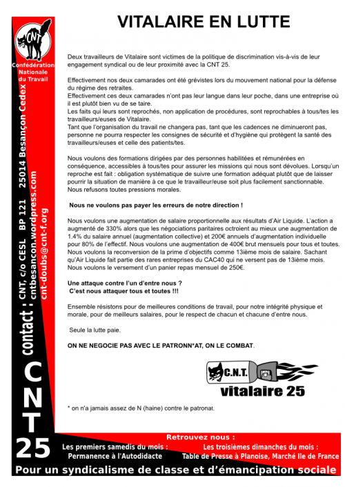 Les travailleurs de Vitalaire, prestataire de santé à domicile, filiale du groupe Air Liquide, de l’agence de Besançon, sont en grève depuis le 12 janvier dernier, en soutien à deux collègues menacés de sanction disciplinaire. Ces sanctions disciplinaires démontrent avant tout les défaillances de l’organisation du travail et la détérioration des conditions de travail au sein de l’entreprise. Plusieurs piquets ont été organisé devant le siège social et l’agence de Belfort.