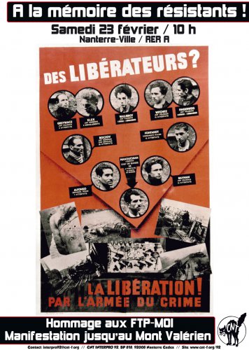Nous, syndicalistes de la CNT, appelons à venir manifester ce samedi 23 février 2013 à partir de 10h à Nanterre en hommage aux résistants appartenant aux FTP-MOI, exécutés le 21 février 1944 par l’occupant nazi au Mont-Valérien.