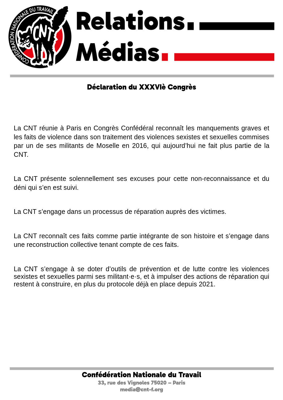 La CNT réunie à Paris en Congrès Confédéral reconnaît les manquements graves et les faits de violence dans son traitement des violences sexistes et sexuelles commises par un de ses militants de Moselle en 2016, qui aujourd’hui ne fait plus partie de la CNT.