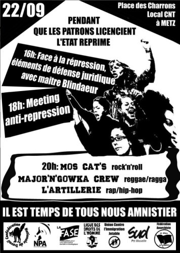 Premiers signataires :CNT 57, FASE 57, Fédération Anarchiste, LDH 57, NPA 57, Sud PTT 57, UCIJ 57