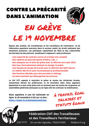 La CNT FTTT appelle à rejoindre la grève et toutes les initiatives locales,notamment devant les préfectures, le 19 novembre 2021. Nous appelons également à ce que cette grève soit un moment pour les anims de s’organiser en assemblées générales physiques ou en ligne afin de continuer la mobilisation.