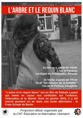 La CNT Éducation et Alternative Libertaire organisent la projection du film documentaire L’arbre et le requin blanc, en présence de la réalisatrice Rafaèle Layani, le jeudi 15 février au bar le Panama (Rennes) et le vendredi 16 février aux local « les oiseaux de la tempête » (Fougères).