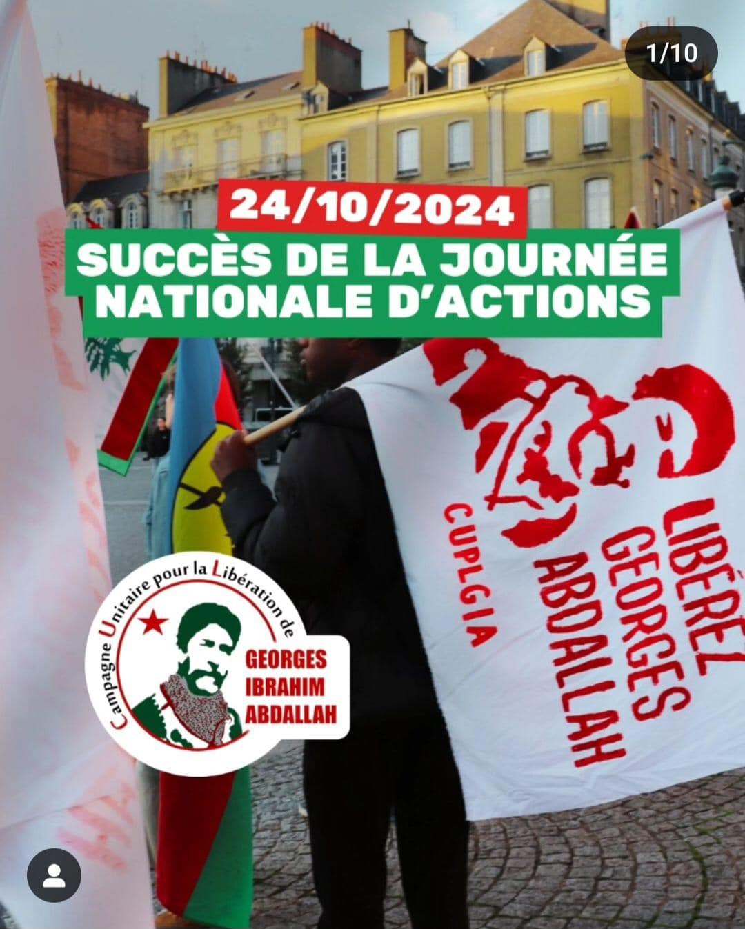 La mobilisation ne cesse de s’amplifier et d’ores et déjà est fixée une prochaine journée d’actions coordonnées pour toujours plus accentuer la pression : le jeudi 14 novembre, soyons massivement présents devant toutes les instances de l’État français en cette veille du rendu du délibéré des juges sur la potentielle libération de notre camarade Georges Abdallah.