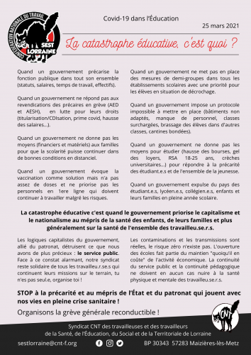 La catastrophe éducative c’est quand le gouvernement priorise le capitalisme et le nationalisme au mépris de la santé des enfants, de leurs familles et plus généralement sur la santé de l’ensemble des travailleu.se.r.s.