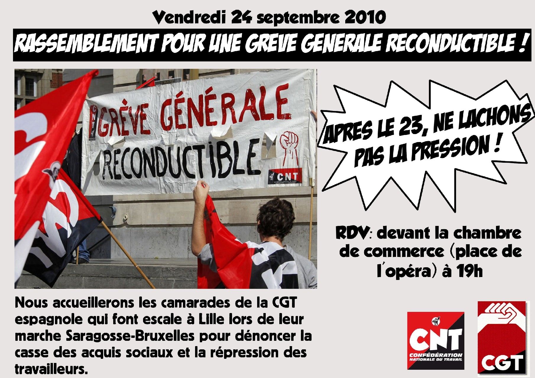 Vendredi 24 septembre 2010, l’union locale des syndicats CNT de Lille accueillera les camarades de la CGT espagnole qui font escale à Lille lors de leur marche Saragosse-Bruxelles pour dénoncer la casse des acquis sociaux et la répression des travailleurs (plus d’infos sur cette marche sur le site http://www.cgt.org.es/ ). Ce sera l’occasion de défendre ensemble l’idée de la nécessité d’un mouvement d’ampleur et de grève générale reconductible, seule arme conséquente des salarié.e.s face à la politique de destruction des acquis sociaux des travailleurs et travailleuses, en France comme dans toute l’Europe.