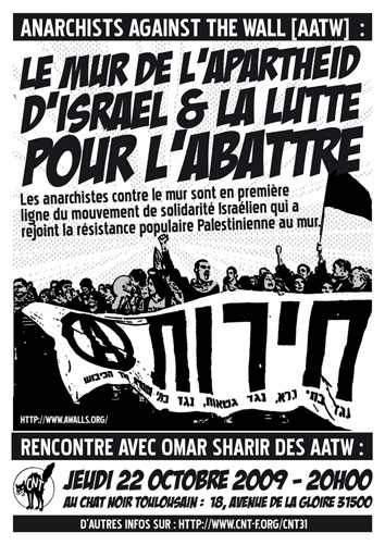 Organisés en 2003, les Anarchistes contre le mur se composent de jeunes Israéliens qui travaillent étroitement avec les comités populaires de villages palestiniens, dans le but de résister à l’occupation israélienne. Ils n’ont pas de leader officiel, pas de bureau, pas d’équipe payée, et pourtant ils sont parvenus à accomplir davantage que beaucoup d’ONG et de mouvements sociaux bien rôdés. Jusqu’à présent, 19 Palestiniens ont été assassiné par l’armée pour avoir manifester contre le mur. Beaucoup d’autres, des Israéliens et des étrangers ont été blessés. En plus du risque physique, les opposants font face au risque de l’arrestation et de l’emprisonnement. Pour continuer la lutte contre le mur AATW recherche des soutiens. Le groupe fait actuellement face à Environ 60 actes d’accusation et les arrestations continuent toutes les semaines. Omer Sharir, un membre d’AATW sera en Europe du 16 septembre au 24 octobre pour nous parler de la situation actuelle. Il sera présent le jeudi 22 Octobre 2009 à 20h00 au local de la CNT 31 (18 avenue de la Gloire à Toulouse ).