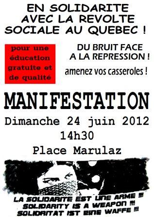 Solidarité avec la révolte sociale au Québec ! Manifestation à Besançon, dimanche 24 juin 2012 à 14h30 ! Amenez vos casseroles ou autres pour faire du bruit contre la répression et la hausse des frais de scolarité !