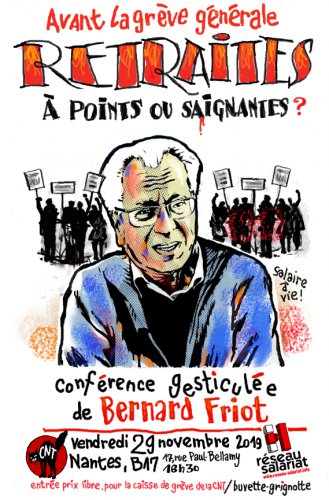 Le vendredi 29 novembre, en prévision de la grève générale qui débutera le 5 décembre, la CNT 44 reçoit Bernard Friot qui présentera sa conférence gesticulée "Je veux décider du travail jusqu’à ma mort".