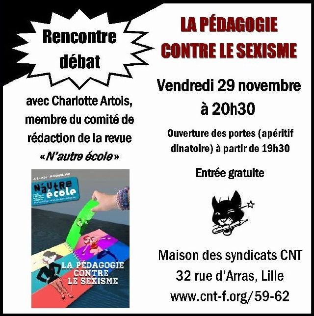 Vendredi 29 novembre 2013, le syndicat CNT éducation du Nord Pas-de-Calais (ssec5962 cnt-f.org) organise une rencontre-débat avec Charlotte Artois, membre du comité de rédaction de "N’Autre école", la revue de la fédération CNT des travailleuses et travailleurs de l’Éducation. Cette rencontre portera sur le contenu du dernier numéro de la revue : la pédagogie contre le sexisme.