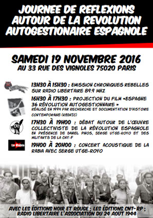 Cette journée de réflexions consacrée à l’œuvre collectiviste de la révolution espagnole, a pour but de montrer, à partir de plusieurs ouvrages — le Rêve égalitaire de Pelai Pagès, A Zaragoza o al charco des Gimenologues, la Collectivisation en Espagne par le collectif REDHIC — comment les travailleurs et les travailleuses prirent en charge le fonctionnement et l’exploitation des entreprises et des propriétés agricoles. On ne peut qu’être enthousiaste devant l’ampleur des expériences réussies de gestion directe. L’œuvre exemplaire de la révolution espagnole prouve que des secteurs entiers de la vie économique et sociale peuvent être autogérés par les travailleurs et les travailleuses sans l’intervention de l’État et du patronat.