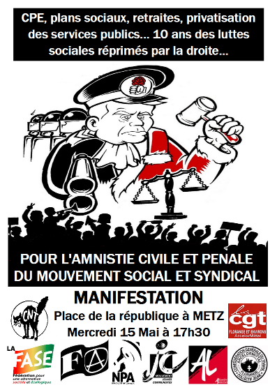 Nous exigeons de François HOLLANDE et de son gouvernement qu’ils amnistient, CIVILEMENT ET PÉNALEMENT, pour tous les faits commis depuis le 1er janvier 2002 jusqu’à ce jour, tous ceux et celles qui ont été condamné-e-s pour leur participation aux mobilisations sociales et qu’ils en finissent avec les politiques répressives. Pour ce faire, l’occasion leur en est donnée. Ce n’est que dans ce cadre que le projet de loi qui sera étudié à l’Assemblée Nationale ce jeudi 16 mai pourrait avoir du sens.