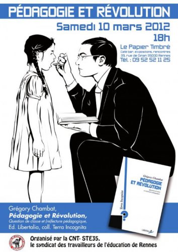 Le Syndicat des Travailleurs de l’Education de la CNT35 vous invite à venir rencontrer Gregory Chambat auteur de "Pédagogie et Révolution" le samedi 10 mars à 18h au Papier Timbré. Ce sera l’occasion de discuter des liens qui existent entre Education, Economie et Politique à l’heure actuelle pour remonter à l’histoire des mouvements pédagogiques qui ont pensé une autre forme de société émancipatrice : la thèse du livre de Grégory Chambat est de montrer qu’un projet d’Education authentique doit s’accompagner d’un projet de révolution Sociale.