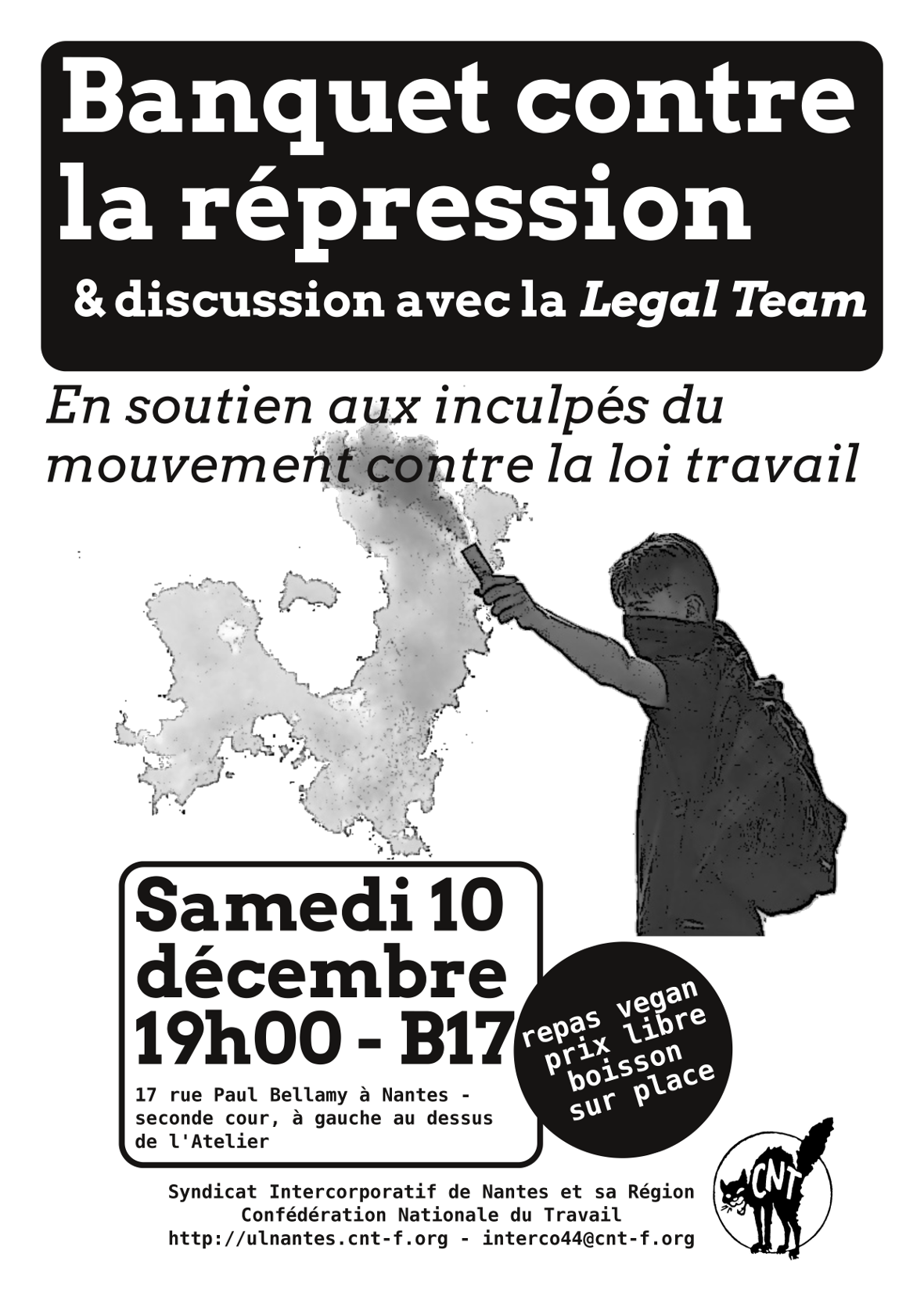 La CNT 44 a décidé de prendre en charge l’intégralité des frais, et de ne pas solliciter la legal team, car nous préférons que les sommes qu’elle récolte servent à des personnes non organisées, en effet à Nantes pendant le mouvement social du printemps la répression a été féroce. Plus de 350 personnes ont été interpellées, dont beaucoup de jeunes et de précaires, et un bon nombre de procès sont encore à venir.