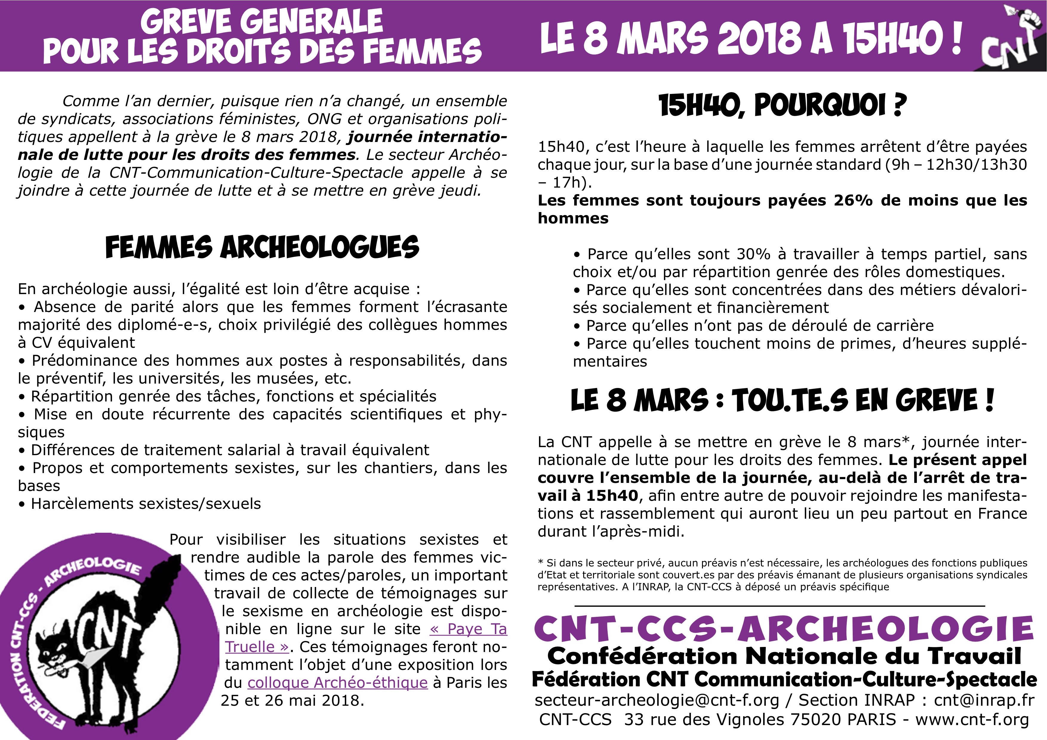 Comme l’an dernier, puisque rien n’a changé, un ensemble de syndicats, associations féministes, ONG et organisations politiques appellent à la grève le 8 mars 2018, journée internationale de lutte pour les droits des femmes. Le secteur Archéologie de la CNT-Communication-Culture-Spectacle appelle à se joindre à cette journée de lutte et à se mettre en grève jeudi.