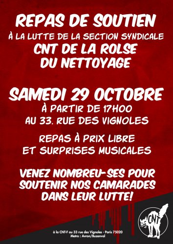 Repas de soutien organisé par les salarié-es de la section CNT de La Rolse du Nettoyage et de leur syndicat ETPICS 94