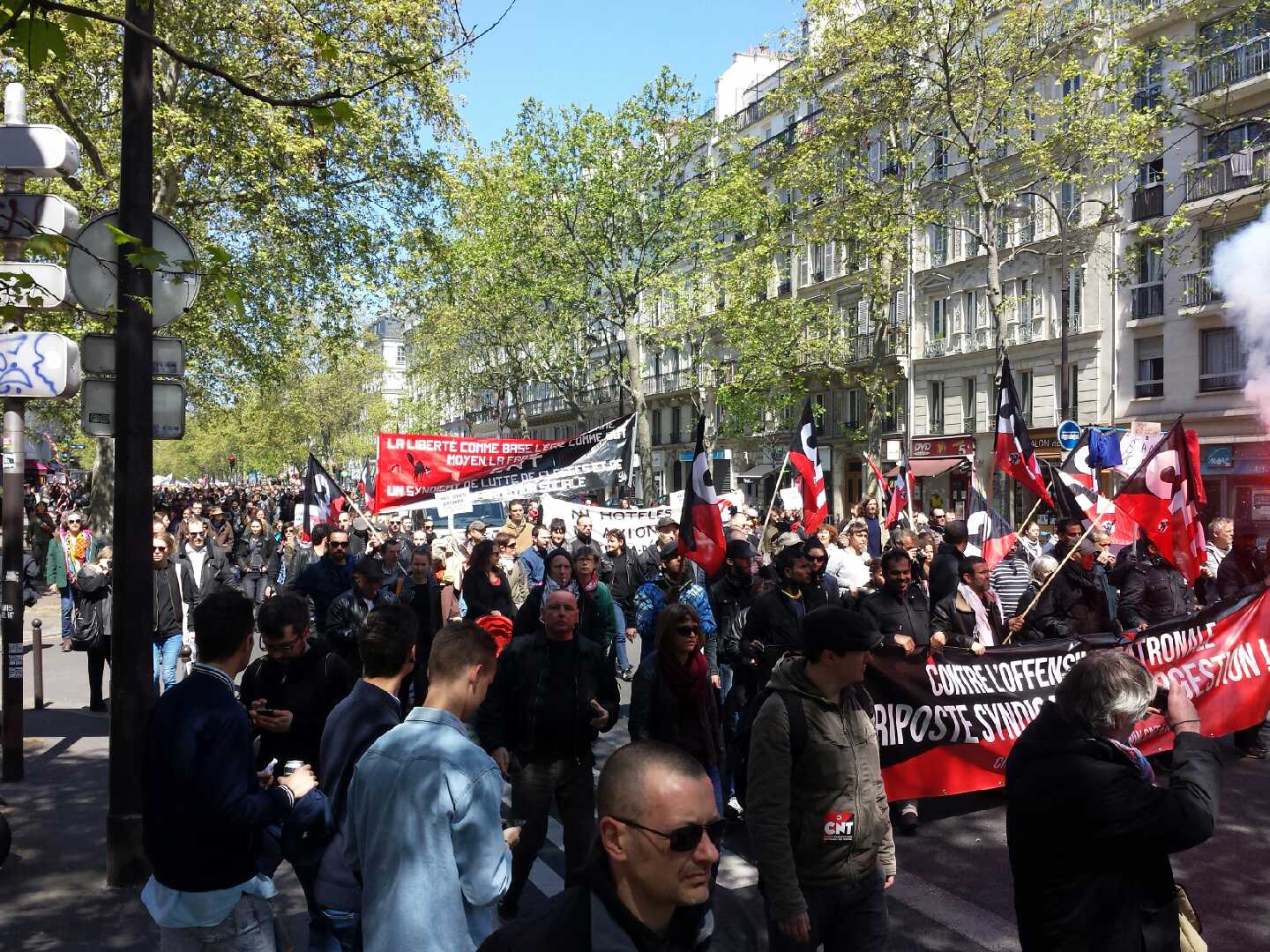 Cependant, peu après le départ à 15 heures de la place de la Bastille, la manifestation a été plusieurs fois interrompue par un important dispositif policier. Vers 16 heures, le cortège a été barré boulevard Diderot par un immense cordon de CRS et de policiers, prenant en nasse plusieurs milliers de manifestants en tête de cortège. Puis la police a violemment chargé ces manifestants et divisé le cortège en deux. Alors qu’elle ouvrait un second parcours pour essayer d’isoler les manifestants nassés, parcours accepté par FO, FSU et Solidaires, la CNT a refusé de quitter le parcours initialement prévu, avec pour idée principale de ne pas abandonner les camarades en tête, et déterminée à repartir, quelle que soit l’attente, en un cortège réuni. C’est ainsi que notre cortège est arrivé place de la Nation sous un épais nuage de lacrymogène.