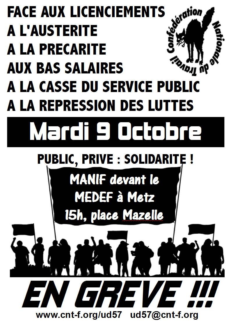 L’après midi du mardi 9 octobre, nos sections syndicales en grève feront la jonction lors d’un rassemblement devant le MEDEF, place Mazelle à Metz auquel nous invitons toutes et tous à venir porter les revendications de la classe populaire :